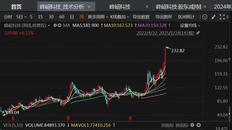 近两年,峰岹科技股价整体明显震荡上涨,股价总体上涨。特别是最近,峰岹科技在2024年12月25日凌晨发布了欲发行H股的公告,迎来了几个交易日的下跌震荡,但自2025年1月6日,股价开始大幅上涨,除了两天下跌外,13个交易日上涨。